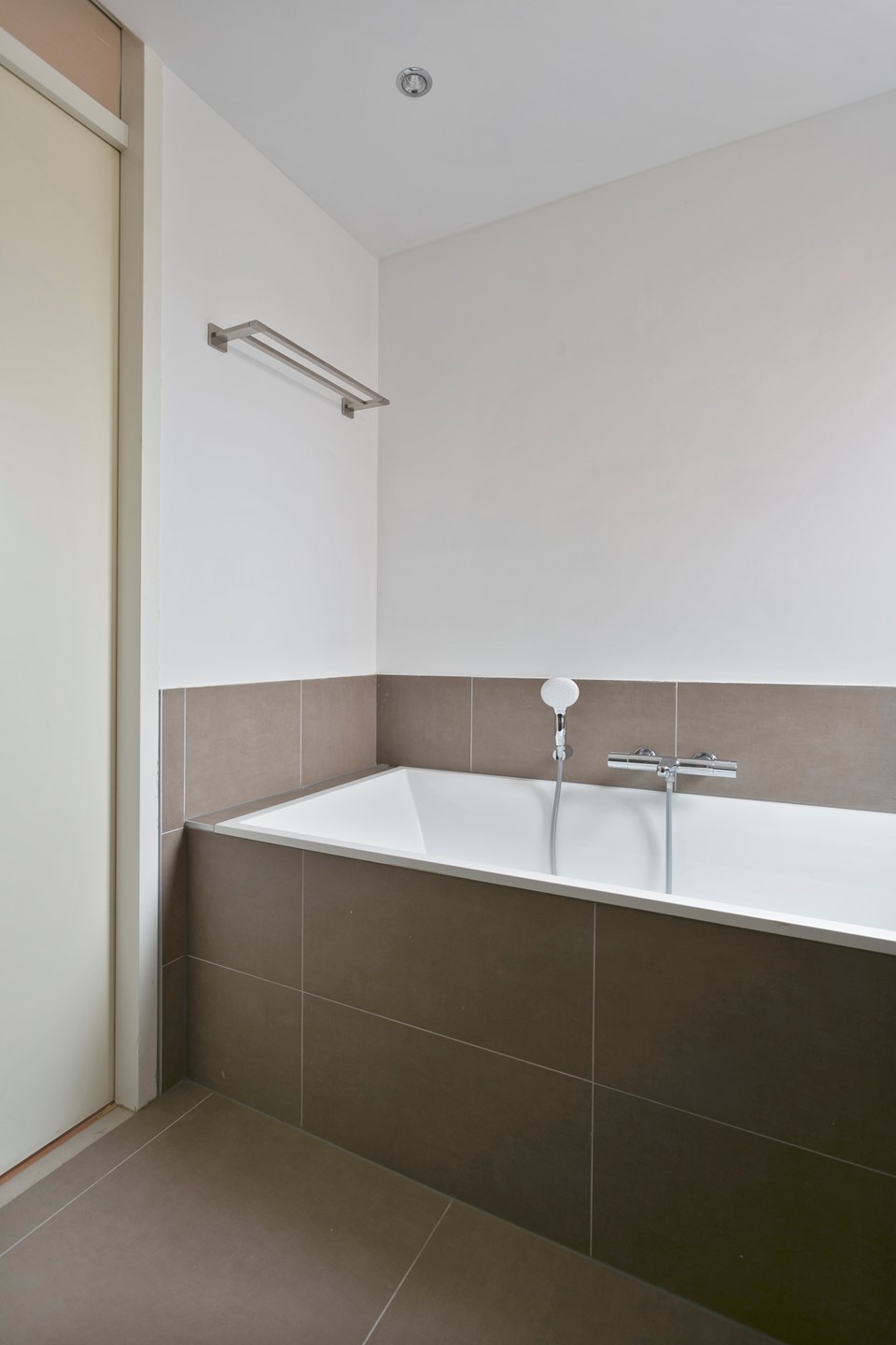 deels betegelde, vernieuwde moderne badkamer (ca. 5 m2) voorzien van ligbad, aparte (regen) douche, badmeubel met vaste wastafel en spiegel met ingebouwde verlichting, designradiator en 2e hangend toilet